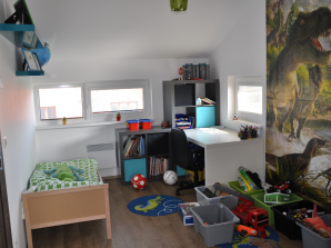 Tento dům není zvětšovaný, s přidaným fixním oknem v obývacím pokoji, horní pokoj je rozdělený na dva dětské pokoje s přidanými okny ve štítě. Koupelna v patře má zkosenou příčku (varianta koupelny číslo 3), v ložnici je vestavná skříň nad schodištěm a prakticky řešená otevřená šatna.