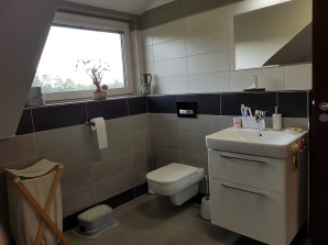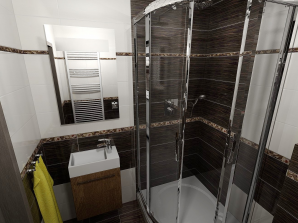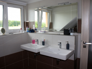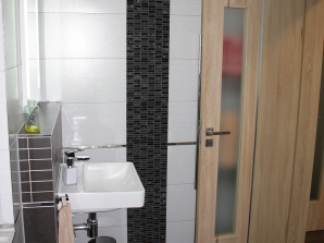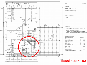 - sanitární vybavení - umyvadlo ze sanitární keramiky v bílé barvě se směšovací pákovou baterií, umývátko ze sanitární keramiky v bílé barvě se směšovací pákovou baterií, vana s pákovou baterií a se sprchovou hadicí a růžicí, sprchový kout včetně baterie se sprchovou hadicí a růžicí a kombinované WC
